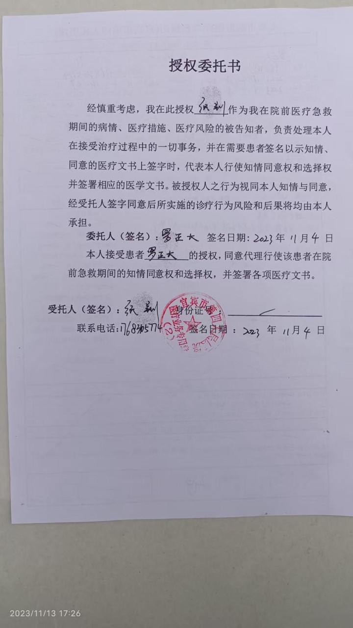 罗正大挂掉电话后,探出头说“这里没有精神病人,你们搞错了”,并往楼下走。当地社区多名工作人员也在现场,罗正大称一名周姓男子抓住他胳膊试图强行将他推上救护车。在双方交涉过程中,又有派出所民警赶到。罗正大继续强调自己没有精神病史,也没吃过治疗精神病的药物。有人向他出示了一张有他本人签名、授权委托张某“负责处理本人在接受治疗过程中的一切事务”的授权委托书。罗正大一看,委托书的签名根本不是自己所写。