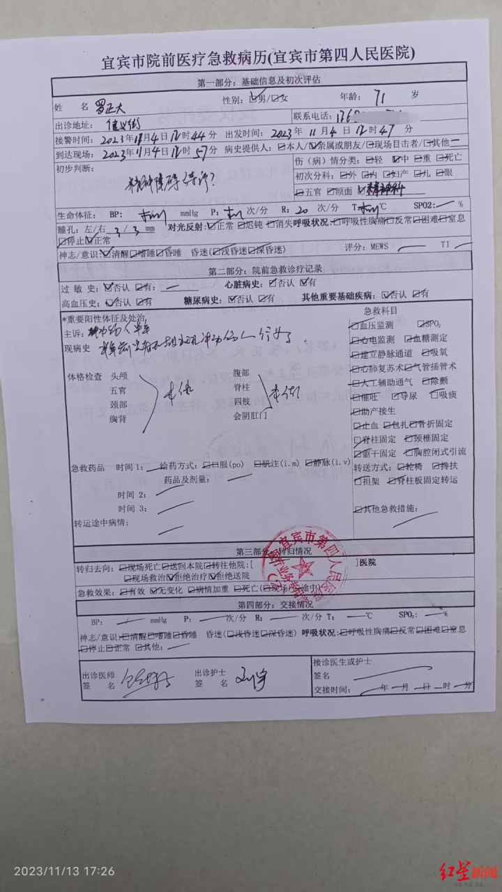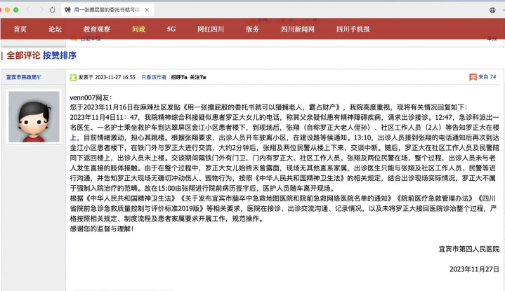 2023年11月27日,宜宾市第四人民医院也对此事作出公开回复:“11月4日11:47,我院精神综合科接疑似患者罗正大女儿的电话,称其父亲疑似患有精神障碍疾病,请求出诊接诊。12:47,急诊科派出一名医生、一名护士乘坐救护车到达翠屏区金江小区患者楼下,到现场后,张翔(自称罗正大老人侄孙)、社区工作人员(2人)等告知罗正大在楼上,目前情绪激动,担心其跳楼。根据张翔要求,出诊人员开车驶离小区,在建设路等候通知。13:10,出诊人员接到张翔的电话通知后再次到达金江小区患者楼下,在铁门外与罗正大进行交流,大约2分钟后,张翔及两位民警从楼上下来,交谈中断。随后,罗正大在社区工作人员及民警陪同下返回楼上,出诊人员未上楼。交谈期间隔着铁门,门外有门卫,门内有罗正大、社区工作人员、张翔及两位民警在场,整个过程,出诊人员未与老人发生直接的肢体接触。由于在整个过程中,罗正大女儿始终未曾露面,现场无其他直系家属,出诊医生只能与张翔及社区工作人员、民警等进行沟通,并告知罗正大现场无确切冲动伤人、毁物行为,按照《中华人民共和国精神卫生法》的相关规定,结合出诊现场实际情况,罗正大不属于强制入院治疗的范畴。故在15:00由张翔进行院前病历签字后,医护人员随车离开现场。”